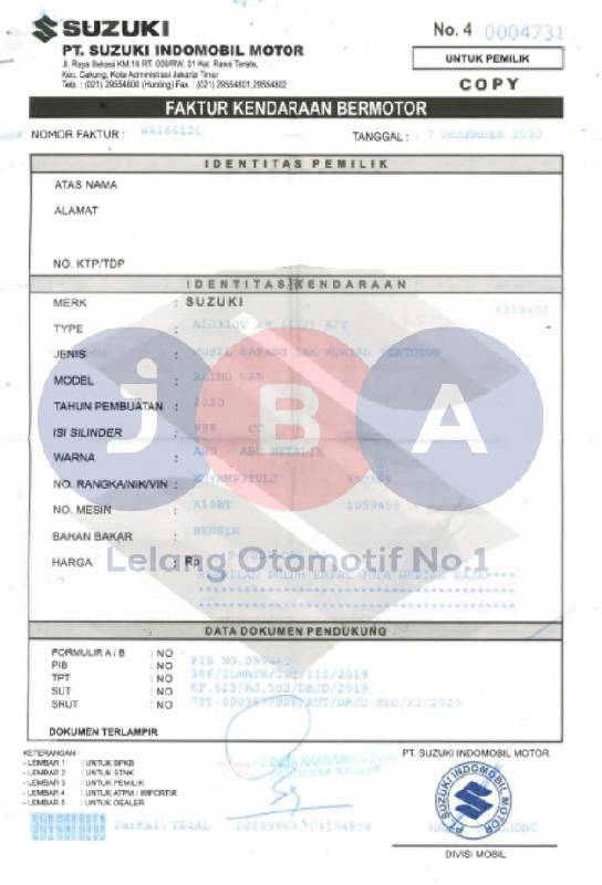 UNIT BERADA DI POOL SELLER // UNIT TIDAK DI CHECKLIST LANGSUNG // WAJIB TTD SURAT PERNYATAAN BERMATERAI DI JBA // WAJIB CEK UNIT DAN DOKUMEN // PEMENANG WAJIB KONFIRMASI KE JBA SETELAH PELUNASAN // PENGAMBILAN UNIT H+7 SETELAH PELUNASAN//KENDALA CEK E SAMSAT // FOTO NOKA NOSIN TDK ADA // AN PT // TERDAPAT PENEBALAN NOPOL DI BPKB