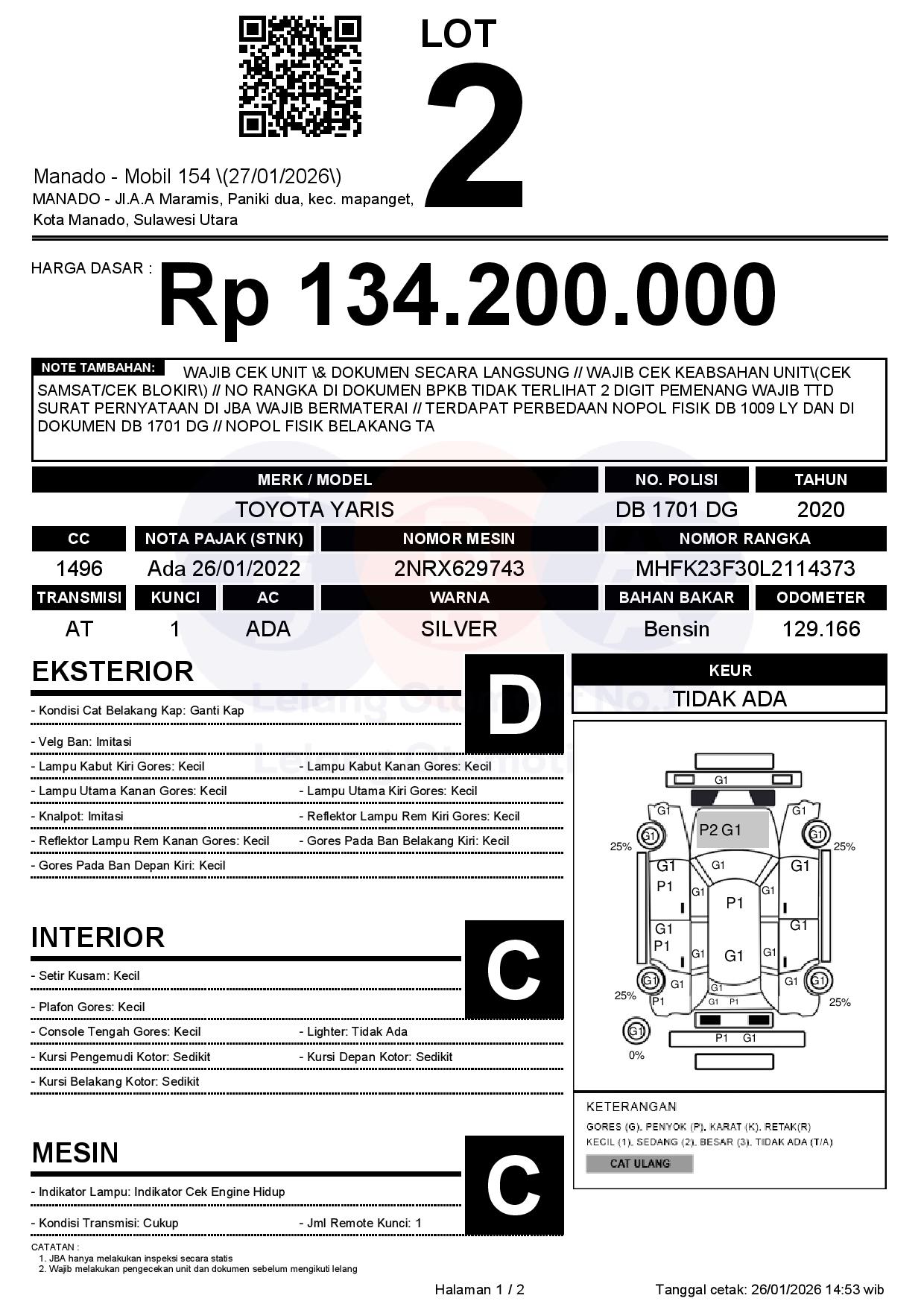 WAJIB CEK UNIT & DOKUMEN SECARA LANGSUNG // WAJIB CEK KEABSAHAN UNIT(CEK SAMSAT/CEK BLOKIR) // NO RANGKA DI DOKUMEN BPKB TIDAK TERLIHAT 2 DIGIT PEMENANG WAJIB TTD SURAT PERNYATAAN DI JBA WAJIB BERMATERAI // TERDAPAT PERBEDAAN NOPOL FISIK DB 1009 LY DAN DI DOKUMEN DB 1701 DG // NOPOL FISIK BELAKANG TA