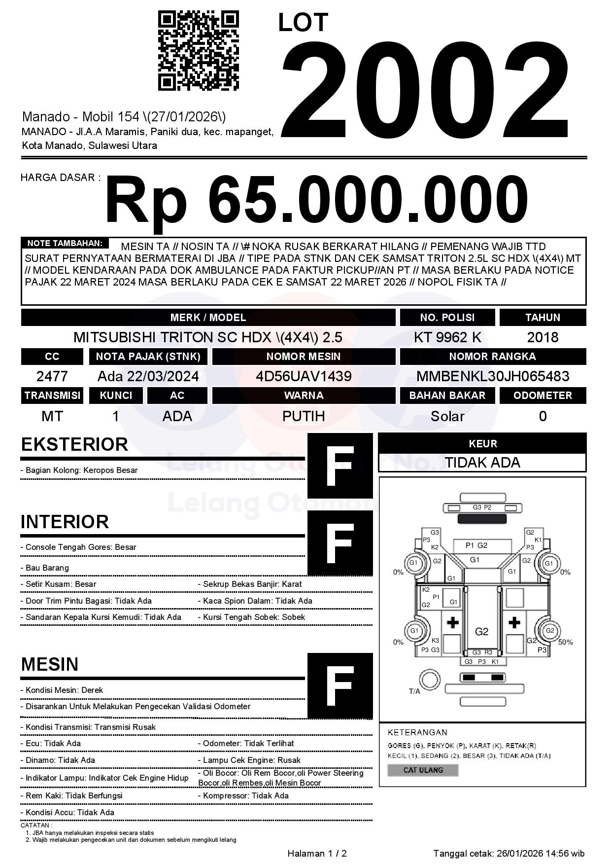 MESIN TA // NOSIN TA // # NOKA RUSAK BERKARAT HILANG // PEMENANG WAJIB TTD SURAT PERNYATAAN BERMATERAI DI JBA // TIPE PADA STNK DAN CEK SAMSAT TRITON 2.5L SC HDX (4X4) MT // MODEL KENDARAAN PADA DOK AMBULANCE PADA FAKTUR PICKUP//AN PT // MASA BERLAKU PADA NOTICE PAJAK 22 MARET 2024 MASA BERLAKU PADA CEK E SAMSAT 22 MARET 2026 // NOPOL FISIK TA //