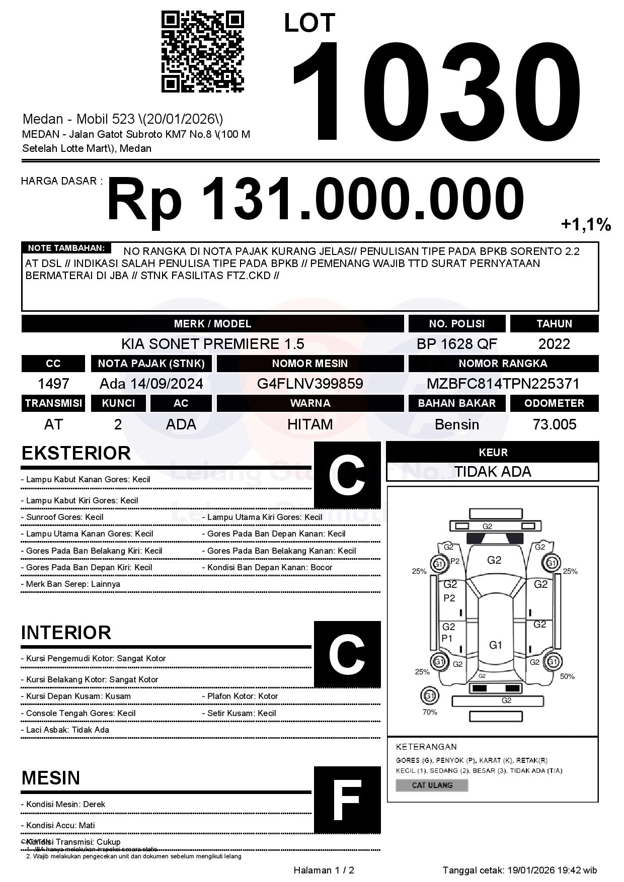 NO RANGKA DI NOTA PAJAK KURANG JELAS// PENULISAN TIPE PADA BPKB SORENTO 2.2 AT DSL // INDIKASI SALAH PENULISA TIPE PADA BPKB // PEMENANG WAJIB TTD SURAT PERNYATAAN BERMATERAI DI JBA // STNK FASILITAS FTZ.CKD //