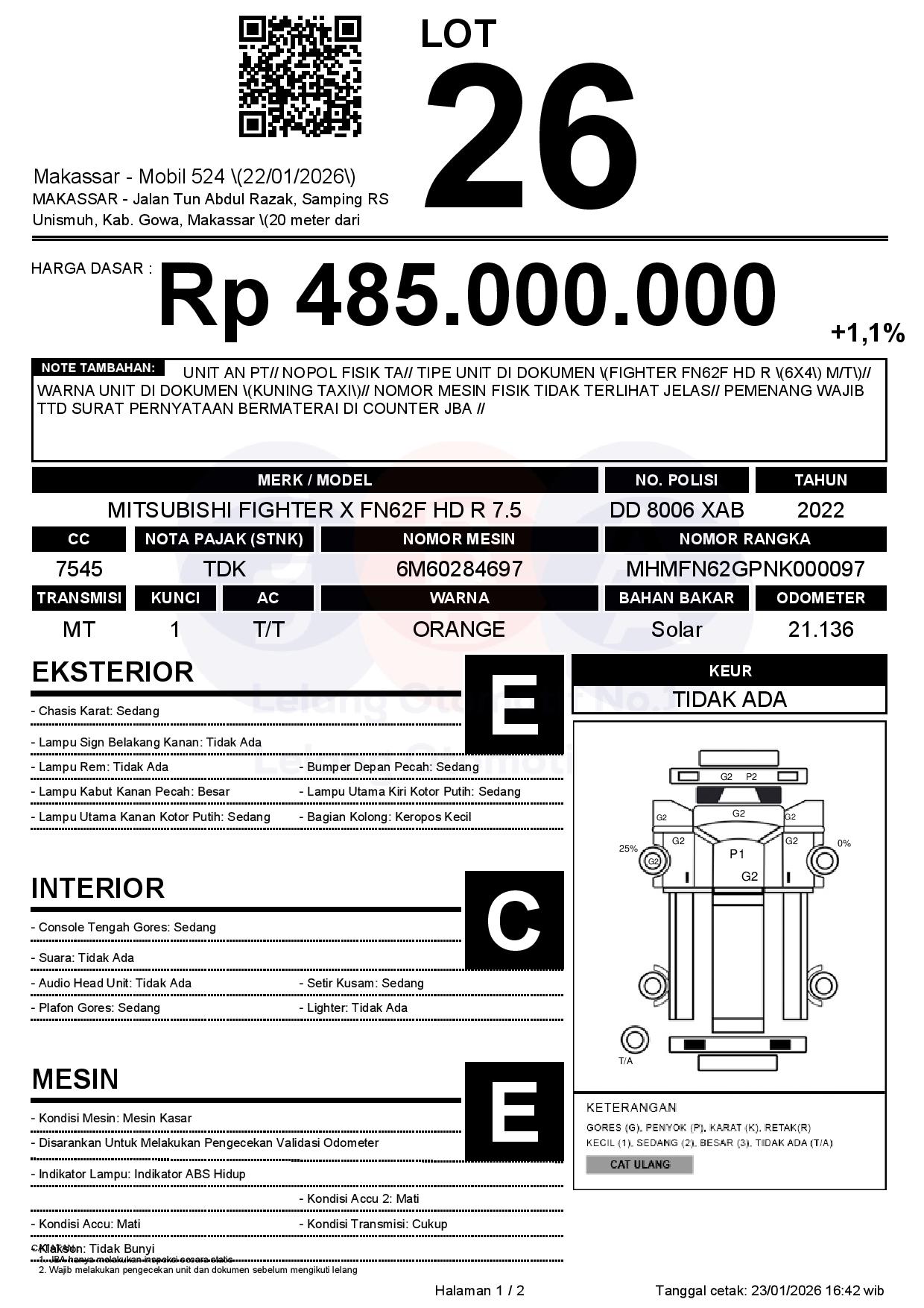 UNIT AN PT// NOPOL FISIK TA// TIPE UNIT DI DOKUMEN (FIGHTER FN62F HD R (6X4) M/T)// WARNA UNIT DI DOKUMEN (KUNING TAXI)// NOMOR MESIN FISIK TIDAK TERLIHAT JELAS// PEMENANG WAJIB TTD SURAT PERNYATAAN BERMATERAI DI COUNTER JBA //