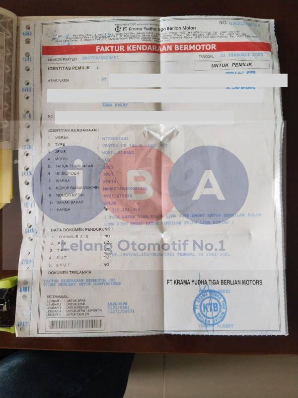 PENULISAN NAMA PEMILIK DI STNK ADA BEKAS HAPUSAN DAN DITULIS ULANG 10 DIGIT // TNKB KUNING // A/N PT // SPH TANPA TTD BERMATERAI // TIPE PADA DOK CANTER FE74L N //